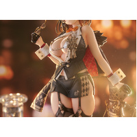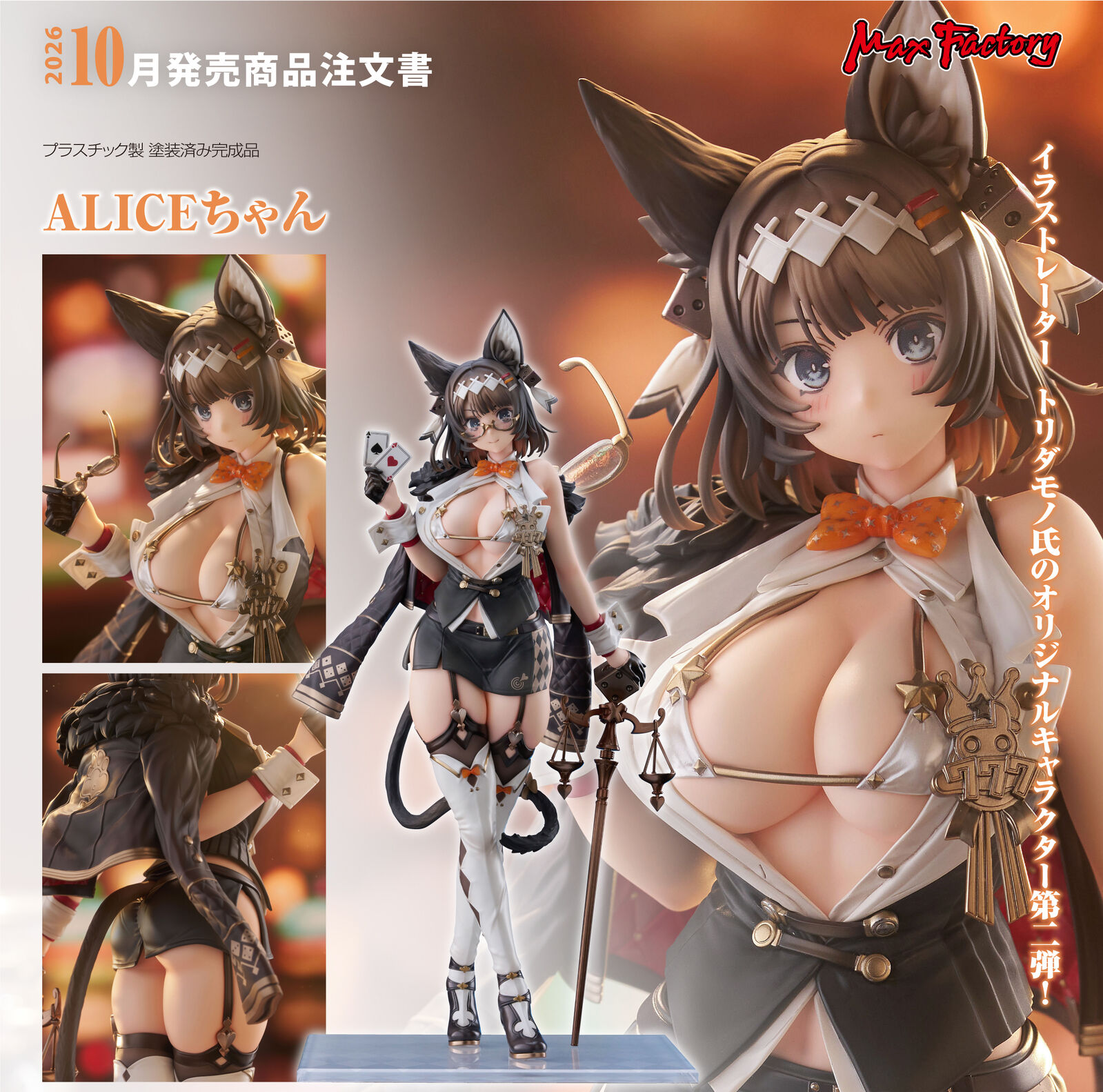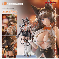 ALICE-chan, an illustration by popular illustrator Toridamono, has been transformed into a new scale figure. She has been faithfully recreated donning her casino dealer-style outfit. The figure features adorable animal ears, an innocent expression, as well as leather and metallic textures. Her expression can also be changed to a smile. She can also wear the glasses in her hands. Be sure to add her to your collection!