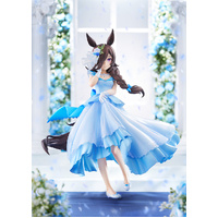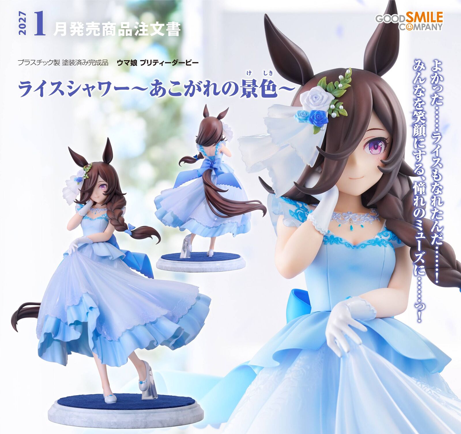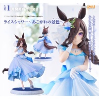 From the game "Umamusume: Pretty Derby" comes a scale figure of the shy and kind-hearted Rice Shower in a wedding dress! The figure features Rice Shower dressed in a beautiful wedding dress, wearing a smile befitting a muse that brings smiles to everyone. Her pale blue dress has been sculpted to give it an airy and light atmosphere. Careful attention has been paid to details such as her various accessories and the lace that embellishes the hem, giving the figure a delicate and dreamy appeal. Be sure to add this beautiful figure of Rice Shower to your collection!