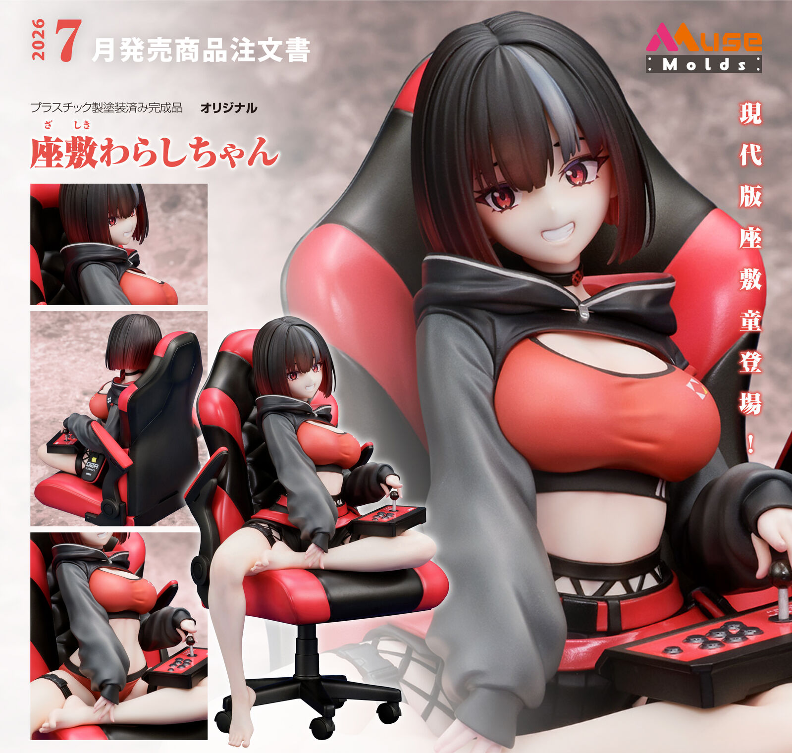 Illustrator Ryousuke Fukai's original character, Zashiki Warashi-chan, has been brought to life in 1/7 scale! Her curves, gaming chair, arcade joystick, plus the detailed design on the chest and waist pouch of this modern household-inhabiting zashiki-warashi youkai have all been meticulously sculpted and painted. Additionally, the lower body parts can be swapped for loungewear. This figure features Zashiki Warashi-chan in relaxing, everyday attire that's different from her usual style. Be sure to add this hardcore gamer zashiki-warashi, complete with her gaming chair and arcade joystick, to your collection!