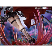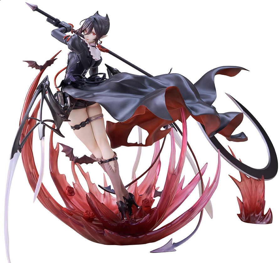 Beyond its sharp and substantial design, the figure enhances its dynamic world-building through the addition of blood and combat effects. Pearl and aurora finishes on the dress’s details create an elegant and ethereal texture, while clear material used for the garter belt conveys a crystal-like transparency and beauty. The custom-designed base features bat and rose motifs, evoking Entelechia’s signature dark and alluring atmosphere.