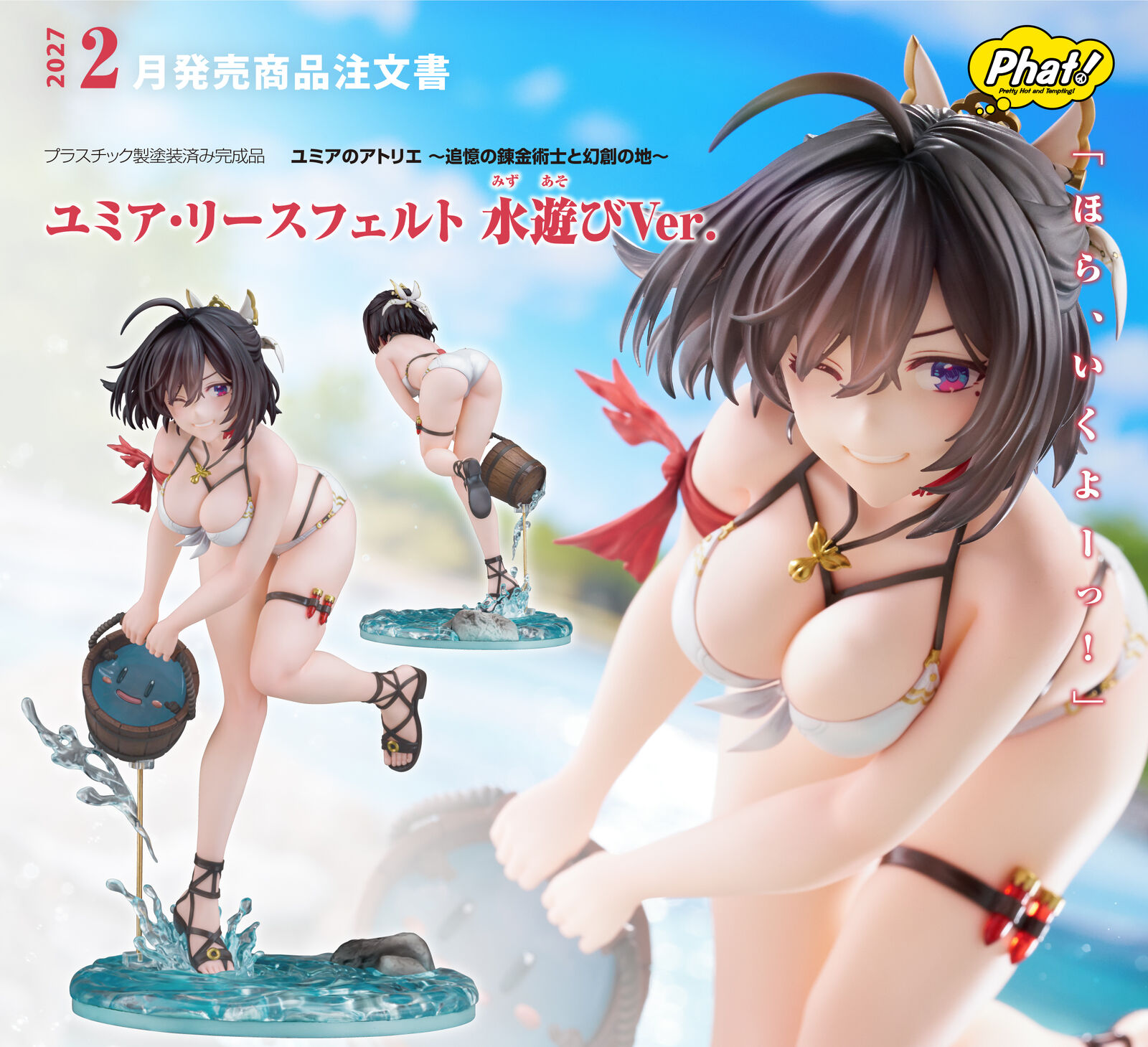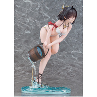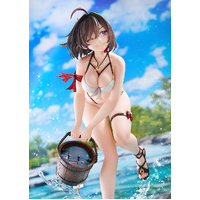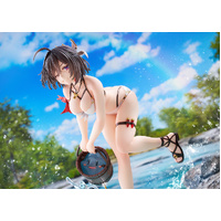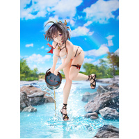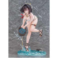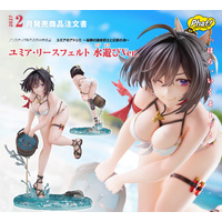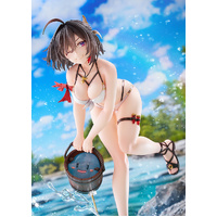 From "Atelier Yumia: The Alchemist of Memories & the Envisioned Land" comes a 1/6 scale figure of Yumia Liessfeldt in a swimsuit, based on an original illustration by Benitama! She has been captured in figure form wearing a pearlescent white bikini as she scoops up Puni with a beaming smile. The natural movement of her body leaning forward accentuates her healthy and supple physique. Yumia's black hair has been carefully sculpted using translucent paintwork to appear as if its blowing in the breeze, while her mischievous smile gazing at the viewer captures a moment of vulnerability. The stand, designed to evoke a riverside setting, features sculpted details that contrast the gentle flow of water with the dynamic splash of droplets. Its paintwork, with a transparent finish suggesting visibility down to the riverbed, gives off a refreshing summer feel. We invite you to welcome this fresh and alluring version of Yumia into your collection, so that you can savor the sparkling moments of summer alongside her.