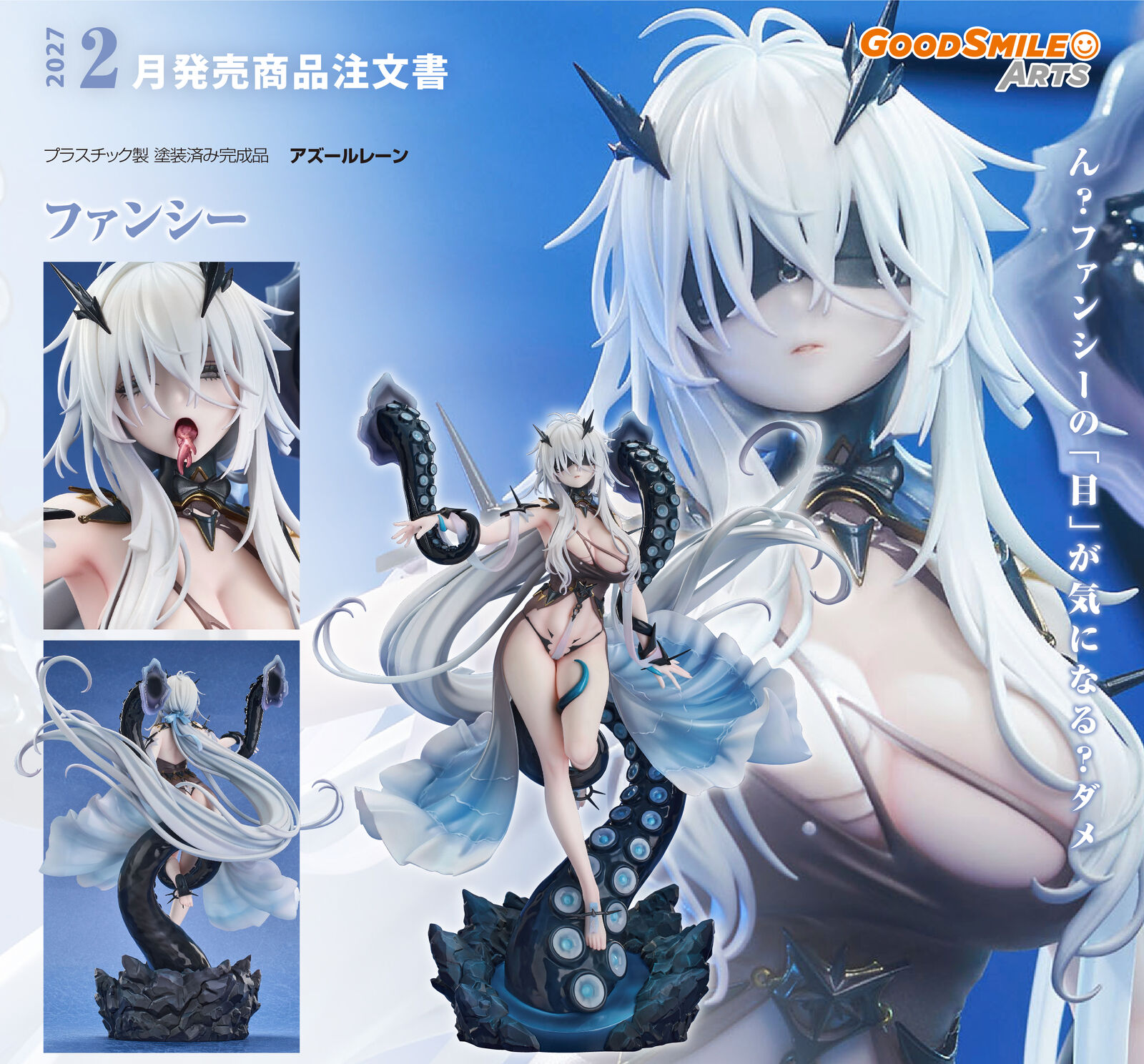 From the popular mobile game "Azur Lane" comes a 1/7 scale figure of Fancy! The Indescribable Something, Fancy the sailing frigate, is making her way to the Commander's collection! Her alluring physique and wispy long hair have been faithfully captured in figure form. Details such as her smooth white skin and outfit have been painted with the utmost care. The curls and slimy texture of her iconic tentacles have been realistically brought to life. An open-eyed face with tongue out parts is also included for displaying Fancy just moments before she "inhales" her prey. Commander, be sure to add Fancy to your collection!