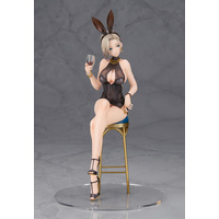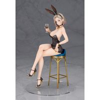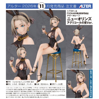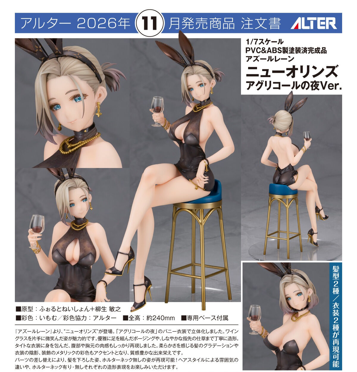 A pre-painted 1/7 scale figure of New Orleans from Azur Lane in the “Evening Agricole” outfit. The sculpt captures her seated on a bar stool with a raised wineglass, wearing a lace-paneled halter-style mini dress with subtle gold accents. Includes optional parts to display her without the halter section and with hair down, plus a display base.