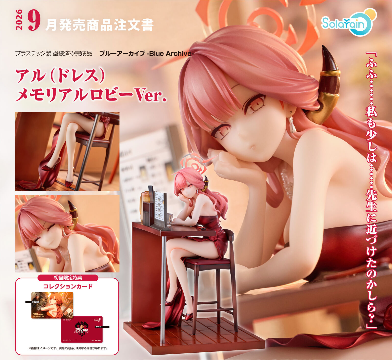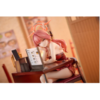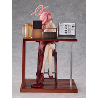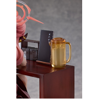 From the popular game "Blue Archive" comes a 1/7 scale figure of Aru, president of Handy Solver 68! Aru is dressed in a glossy, deep crimson high-slit dress, radiating the alluring charm of a lady. With a specially crafted stand resembling a counter seat, this figure faithfully captures the gentle, warm Memorial Lobby scene in which Aru and Sensei quietly chat at a ramen restaurant. Details such the smooth texture of Aru's dress and her swinging earrings, necklace, and red heels have been meticulously realized. Even the glass and other small items have been carefully recreated, preserving the scene in its original form for you to enjoy. An interchangeable smiling face plate is also included. A happy, smiling Aru who is looking forward to spending time with Sensei adds another enjoyable aspect to the figure. Please consider adding this adorable rendition of Aru to your collection!