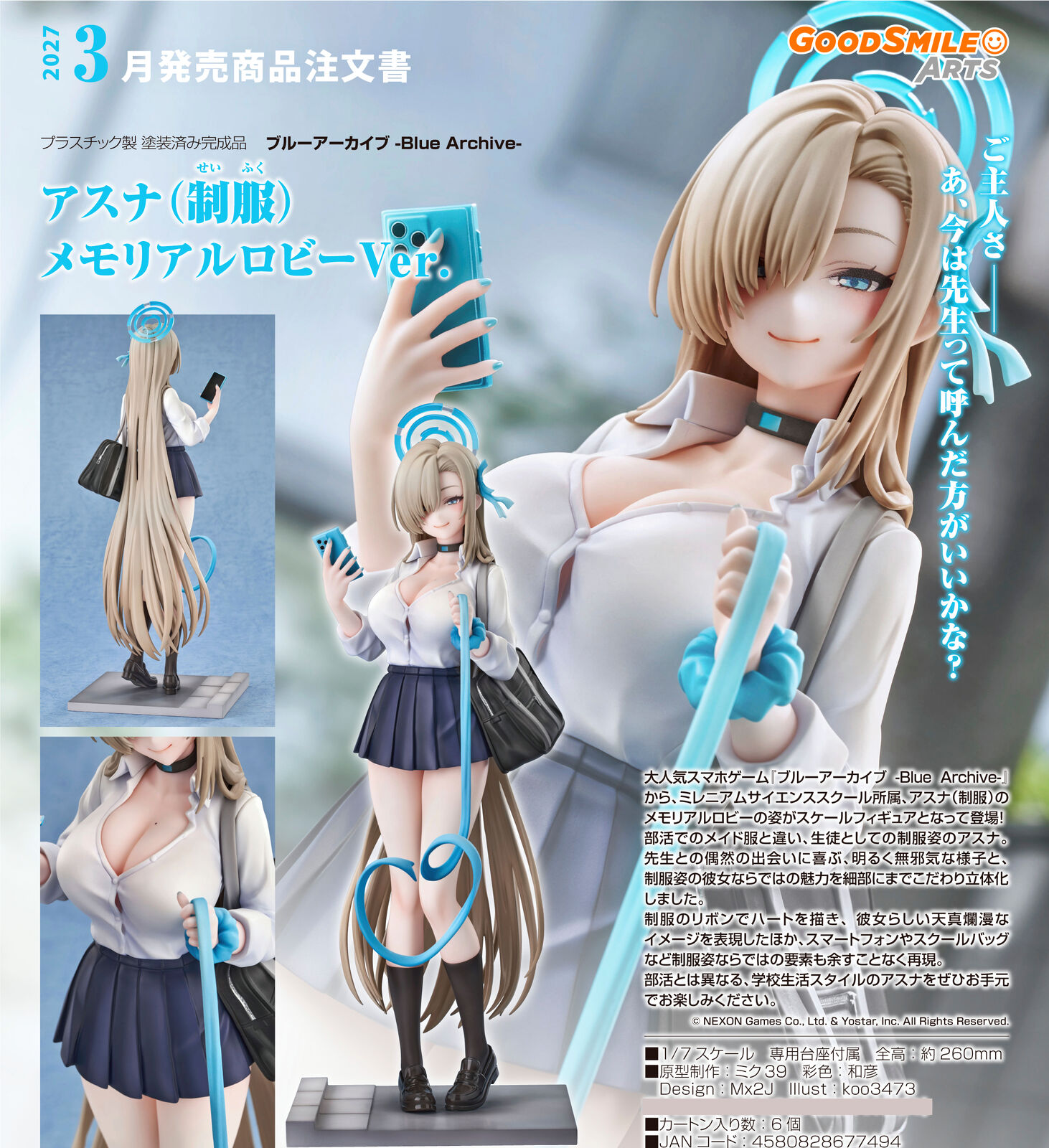 From the popular smartphone game "Blue Archive" comes a scale figure of Asuna in her Memorial Lobby school uniform outfit! Unlike her usual maid outfit, Asuna is dressed in her school uniform. She wears an adorable smile on her face, excited to be meeting Sensei by chance. The charming details of the bright and cheerful Asuna's outfit have been carefully sculpted. Visual highlights such as her heart-shaped ribbon, smartphone and schoolbag have been carefully brought to life in figure form. Be sure to add the adorable and alluring Asuna to your collection!