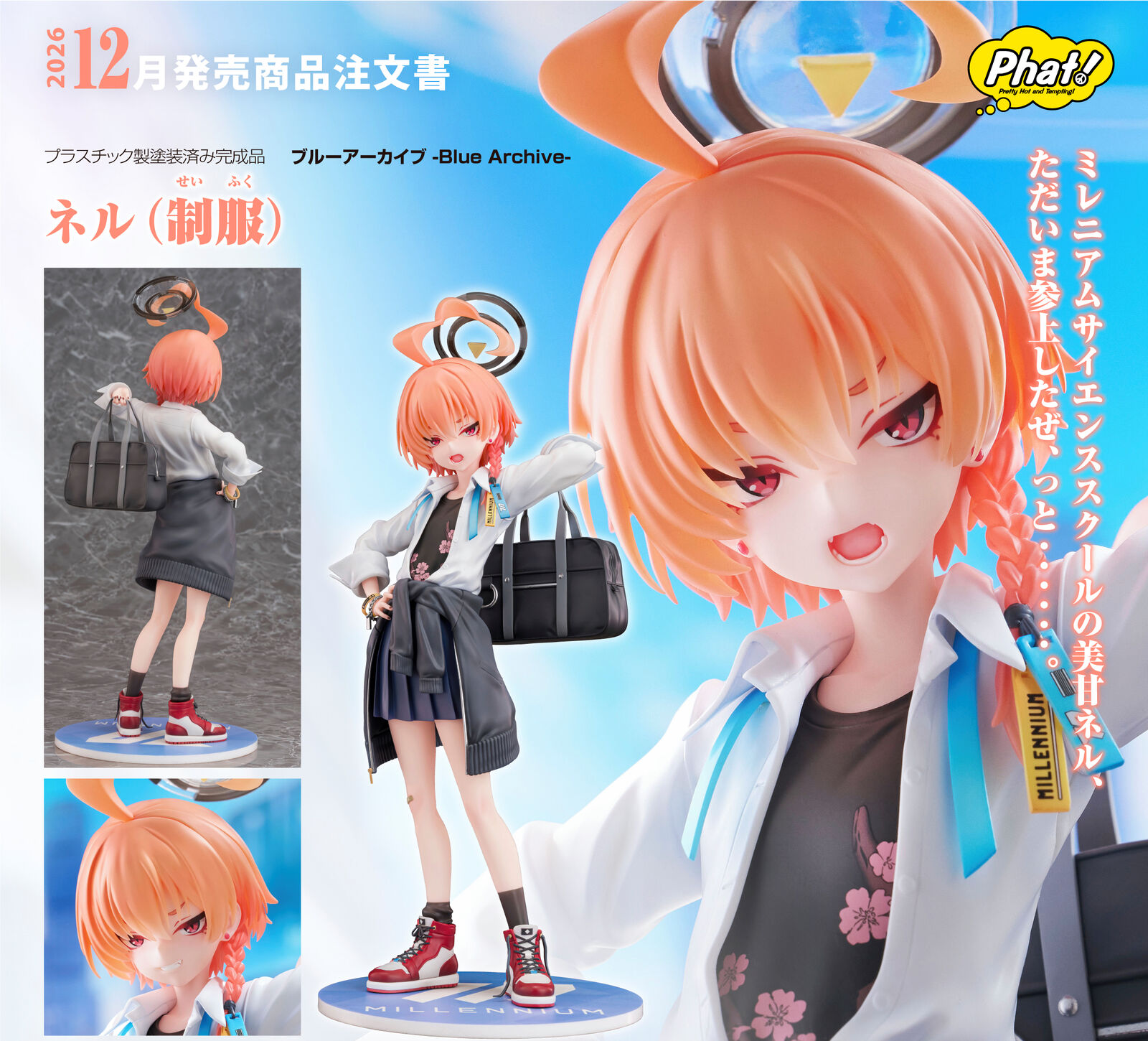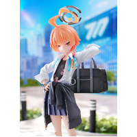 From the popular game "Blue Archive" comes a 1/7 scale figure of Neru Mikamo, the leader of Millennium Science School's intelligence agency, C&C! Neru has been captured in figure form wearing her school uniform, a refreshing change from her usual souvenir jacket and maid uniform style! Details such as her casual styling of her blouse, pleated skirt and school bag slung over her shoulder, as well as her haughty expression have been faithfully brought to life. Her trademark hairstyle has also been carefully recreated, highlighting her intense yet adorable charm. Neru's outfit, down to the texture and details of her sneakers, accessories and bag, have been meticulously translated to figure form to retain her student-like charm from the original illustration. An interchangeable confident face plate is also included for a different display option.