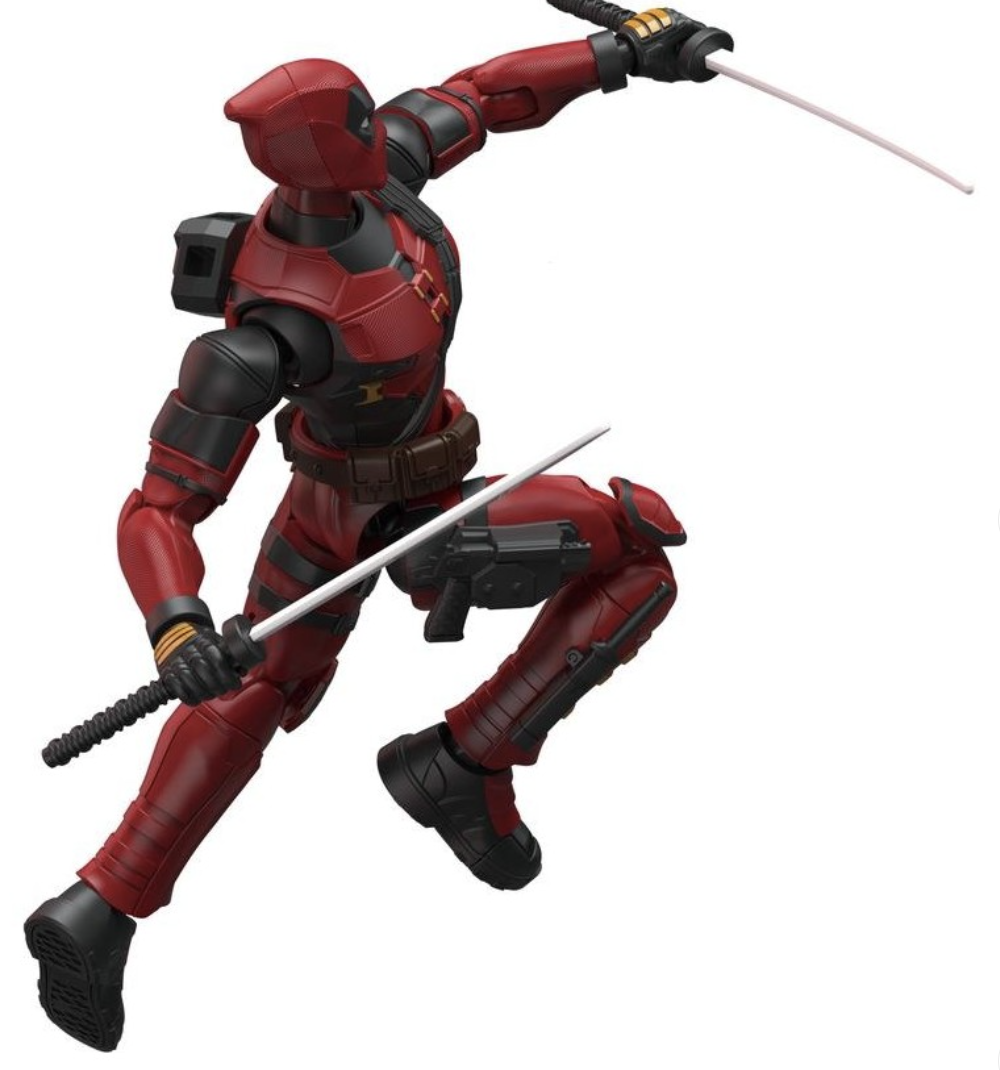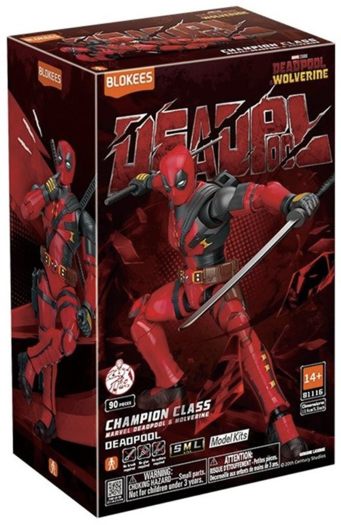 Build this iconic character from Marvel's Deadpool & Wolverine. Deadpool appears in his classic red and black outfit, complete with his iconic belt buckle, and back-mounted sheaths for his dual katanas. This kit contains 90 pieces to assemble your own highly-detailed and articulated action hero.