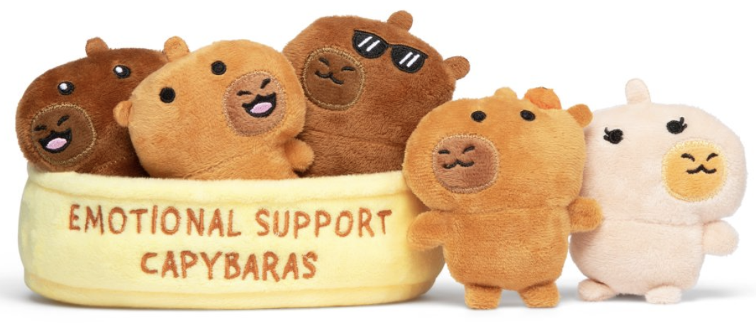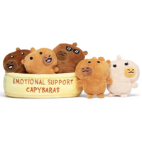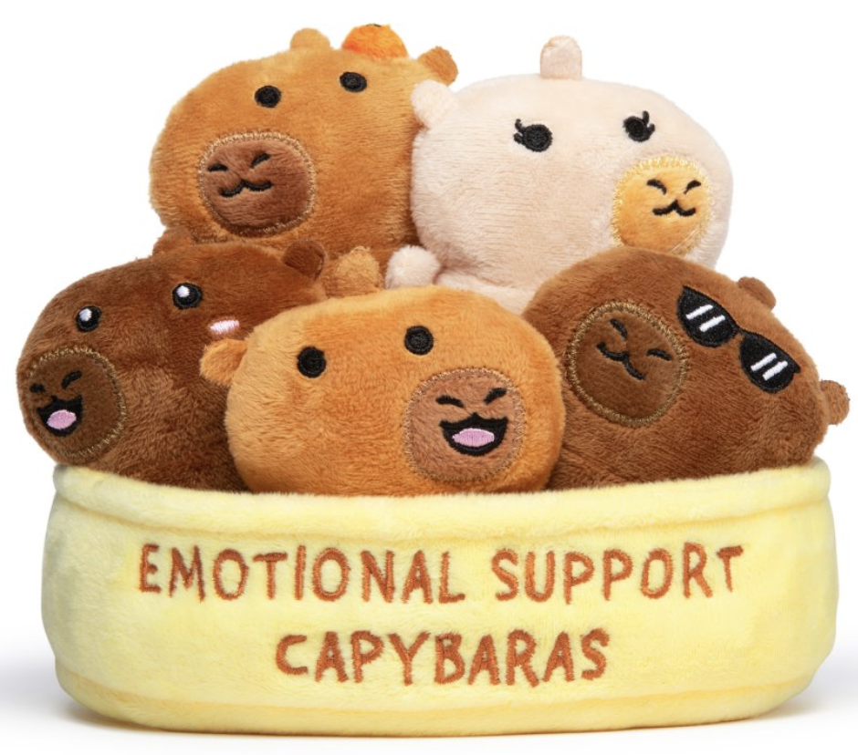 Meet Emotional Support Capybaras: a pocket-size plush herd of calm, cozy cuteness designed to bring instant comfort wherever you are. This set features multiple capybara “personalities” (including a too-cool one in shades) nestled in a soft, display-friendly tray embroidered with “EMOTIONAL SUPPORT CAPYBARAS.”