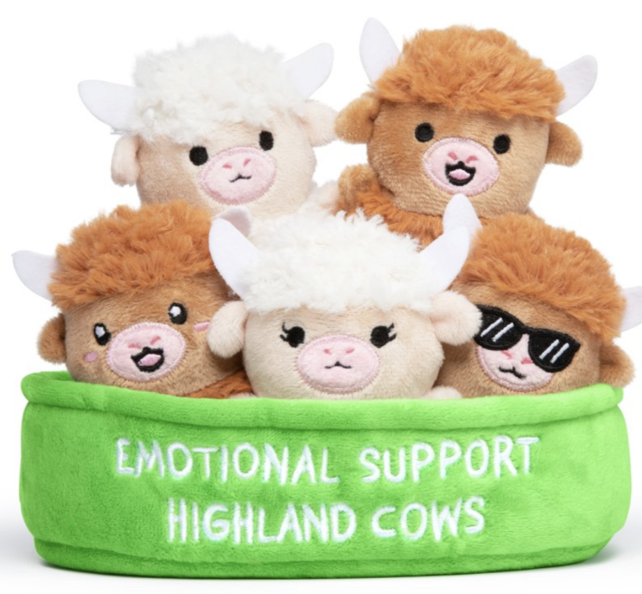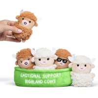 ntroducing Emotional Support Highland Cows: a tiny, fluffy herd of feel-good companions inspired by the world’s cutest shaggy cows. With soft “highland” fur textures, sweet embroidered faces, and a fan-favorite cool cow in shades, this set is built for cozy comfort and instant calm. Everyone nests neatly into a bright green, display-ready tray embroidered with “EMOTIONAL SUPPORT HIGHLAND COWS.”