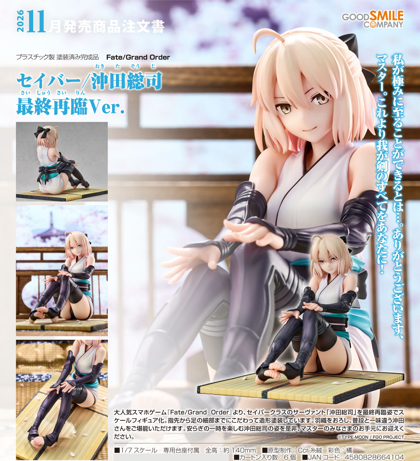 From the hit mobile game "Fate/Grand Order" comes a scale figure of the Saber Class servant Okita Souji in her Final Ascension outfit. The detailed sculpting and paintwork extend from the tips of her fingers to her toes. Enjoy the sight of Souji with her haori lowered for a fresh, new look. Master, be sure to add this figure of Okita Souji enjoying a moment of peace to your collection!