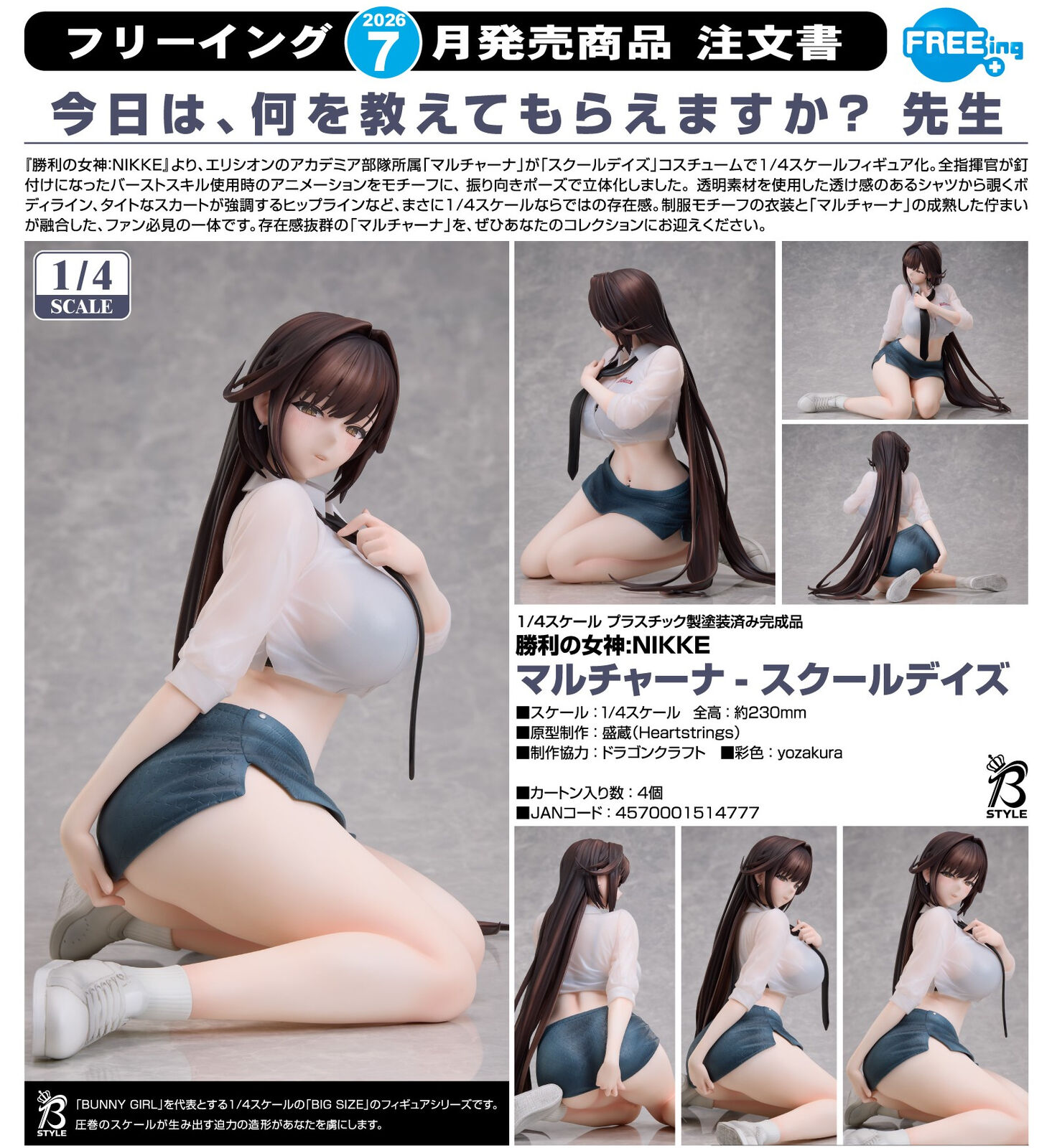 From "GODDESS OF VICTORY: NIKKE" comes a 1/4 scale figure of Marciana, a member of the Elysion Academia squad, in her School Days outfit! Marciana's Burst Skill animation, which has captivated commanders far and wide, has been brought to life in figure form!