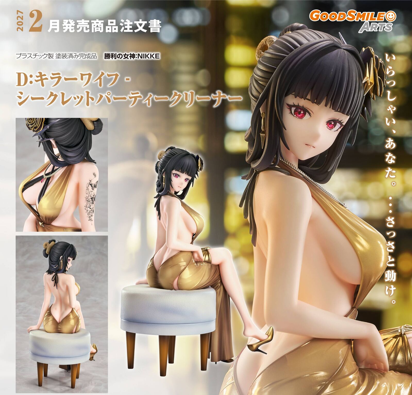 From the popular mobile game "GODDESS OF VICTORY: NIKKE" comes a 1/7 scale figure of D: Killer Wife - Secret Party Cleaner! The luxurious texture and luster of D: Killer Wife's outfit have been carefully recreated with skillful paintwork. It is a figure with plenty to feast your eyes on! When viewed from the back, her elegant physique really shows through! Her mysterious gaze, as though hiding a secret, is sure to draw you in. Be sure to add the exquisite and beautiful D: Killer Wife - Secret Party Cleaner to your collection, Commander!