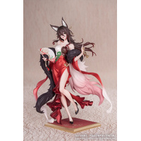 Fugue is dressed in a cheongsam, adorned with intricate embroidery outlined in gold thread across the front. The high-slit design of the skirt highlights her graceful silhouette, while the soft shawl pairs perfectly with her fluffy fox tail. She gently rings the bell in her left hand, its crisp chime said to summon good fortune. In her right, she holds a folding fan, her sleeves flowing with the motion. The figure captures a look that is both magnificent and imbued with a lively, ethereal charm.