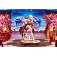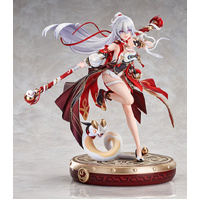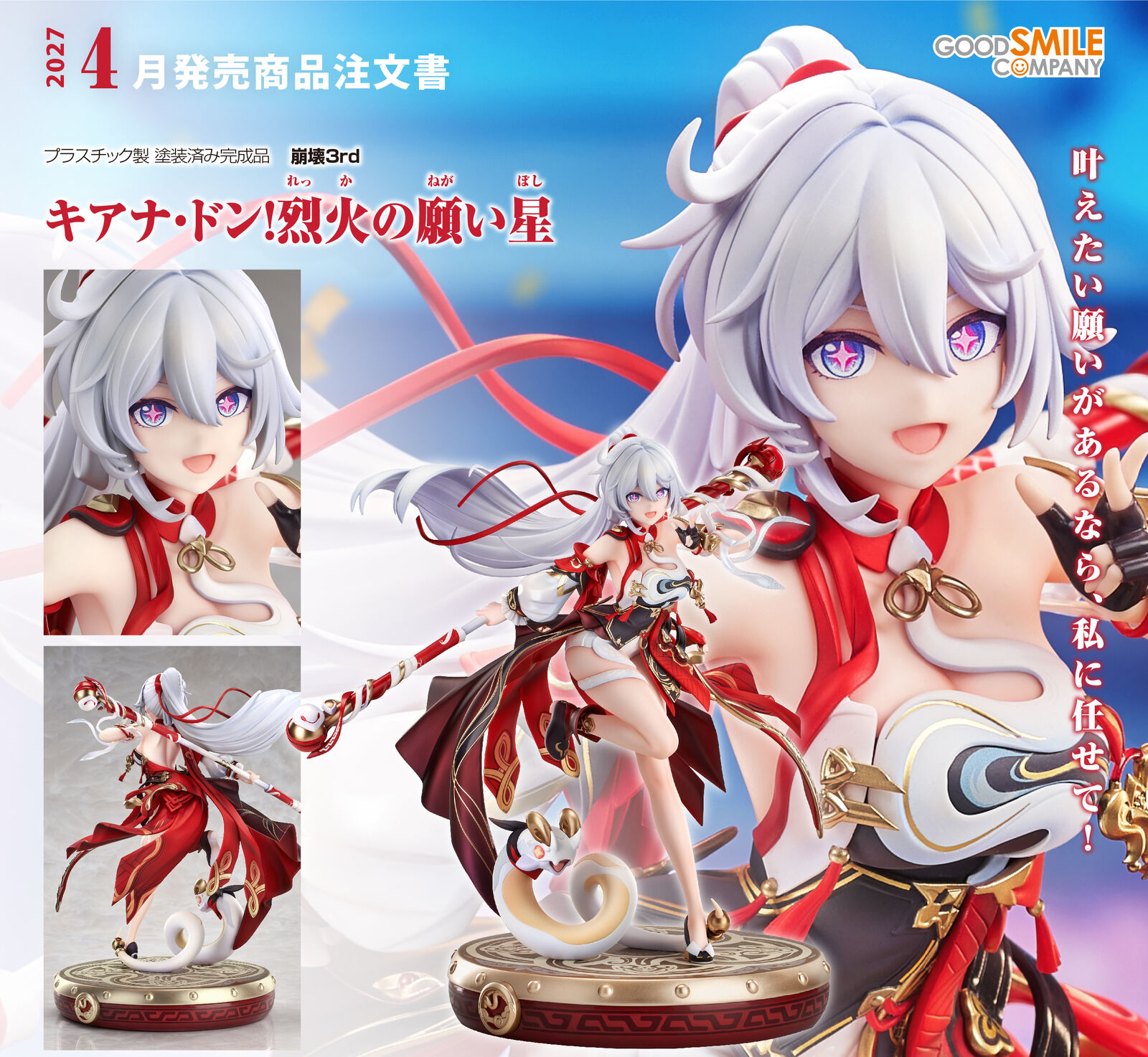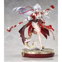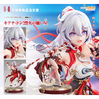 From the popular action game "Houkai 3rd" comes a scale figure of Kiana Kaslana in her "Ba-Dum! Fiery Wishing Star" battlesuit! The figure showcases dynamic posing full of vitality, with Kiana's flowing silvery-white long hair and ribbon creating a beautiful layered effect. The color scheme blends Chinese motifs with an armored design, achieving intricate material textures and visual effects through sophisticated painting techniques that incorporate metallic coloration, a pearl finish, and gradients. The red clothing features special paintwork to express a lustrous sheen reminiscent of Kiana's in-game appearance. Every detail—from the gold patterns on the outfit and the folds of the fabric to the natural flow of the human form—has been meticulously crafted. The dedicated drum themed base features the adorable mascot "Rice Cake," seamlessly complementing the figure's overall concept. Don't miss this chance to add the exquisite and adorable Kiana: Ba-Dum! Fiery Wishing Star to your collection!