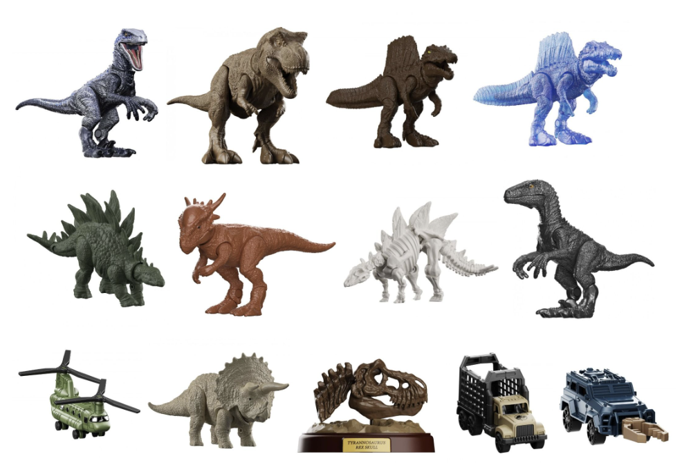 Hunt for Triceratops, Stegosaurus, Spinosaurus, Alternate Colour Spinosaurus, and Stygimoloch, or look for Tyrannosaurus Rex, and Velociraptor. Find special vehicles to help in your capture operation, with Capture Car, Transport Truck, and Helicopter. Display your findings with the Stegosaurus Skeleton, or Tyrannosaurus Rex Skull. Lucky hunters might find Big Tyrannosaurus Rex, and Big Velociraptor, or Baby Tyrannosaurus Rex, and Baby Velociraptor.