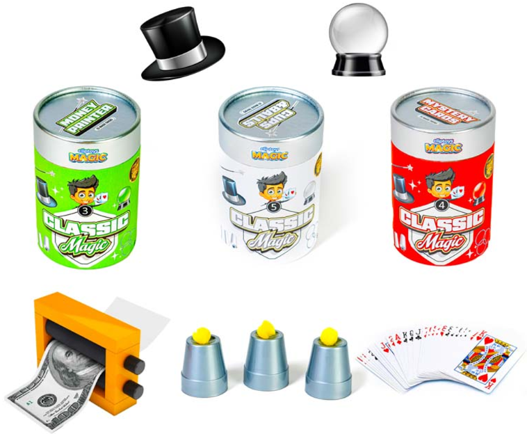 6 unique tricks to collect – Sponge Balls, Illusion Box, Money Printer, Mystery Cards, Cups & Balls, and The Secret Box