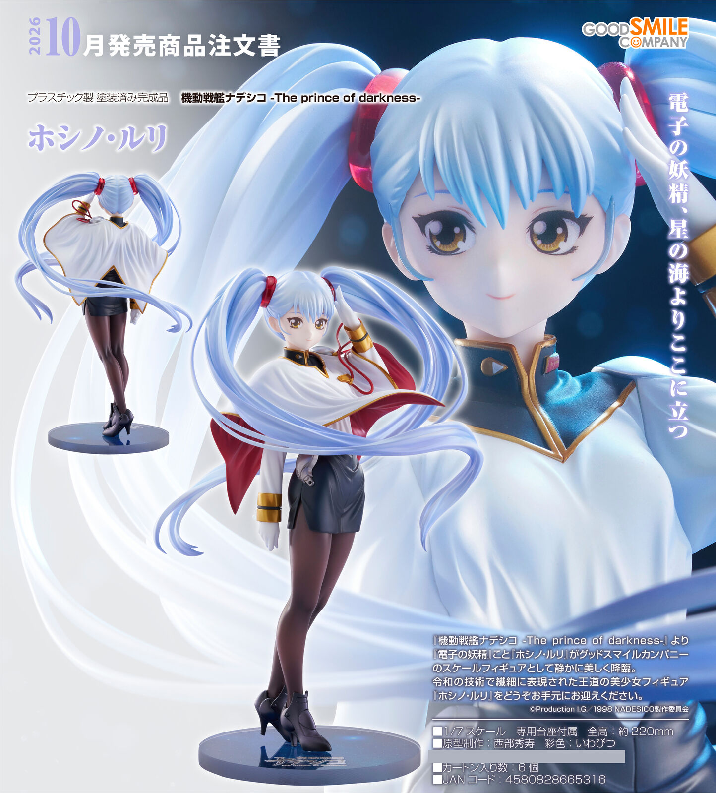 Good Smile Company presents a scale figure of the Electronic Fairy, Ruri Hoshino, from "Martian Successor Nadesico: The Motion Picture – Prince of Darkness". The figure brings to life Ruri's gentle and graceful charm. Be sure to add Ruri Hoshino, carefully crafted with state-of-the-art technology, to your collection!
