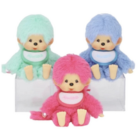 Cute plush Monchhichi, as a timeless and never-ending toy for young and old, or as another original piece for the collection, this time in playful colors (raspberry pink, mint green and blue) in a size of 14 cm!