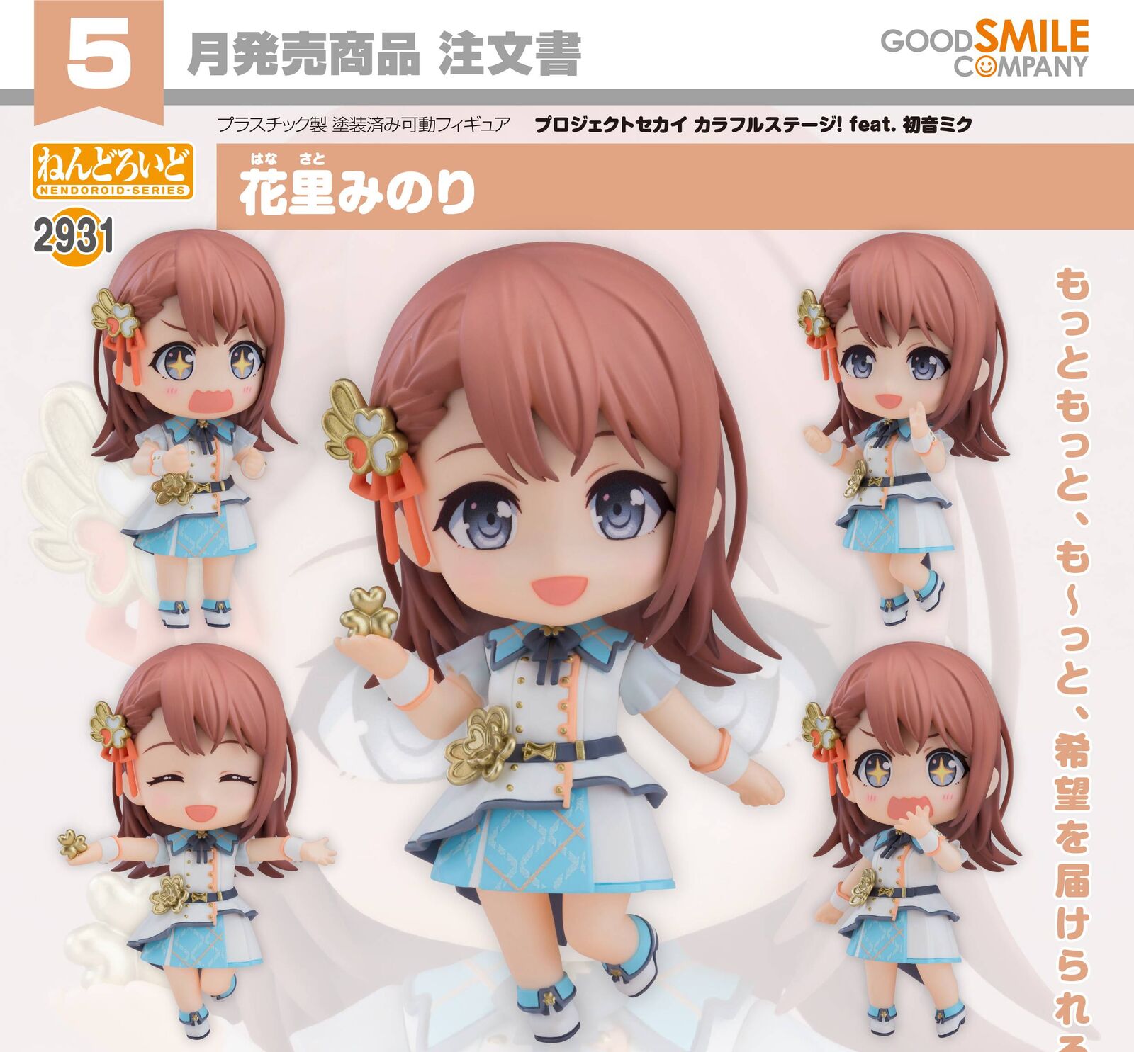 From the iOS/Android rhythm & adventure game "HATSUNE MIKU: COLORFUL STAGE!" comes a Nendoroid of the MORE MORE JUMP! member, Hanasato Minori!