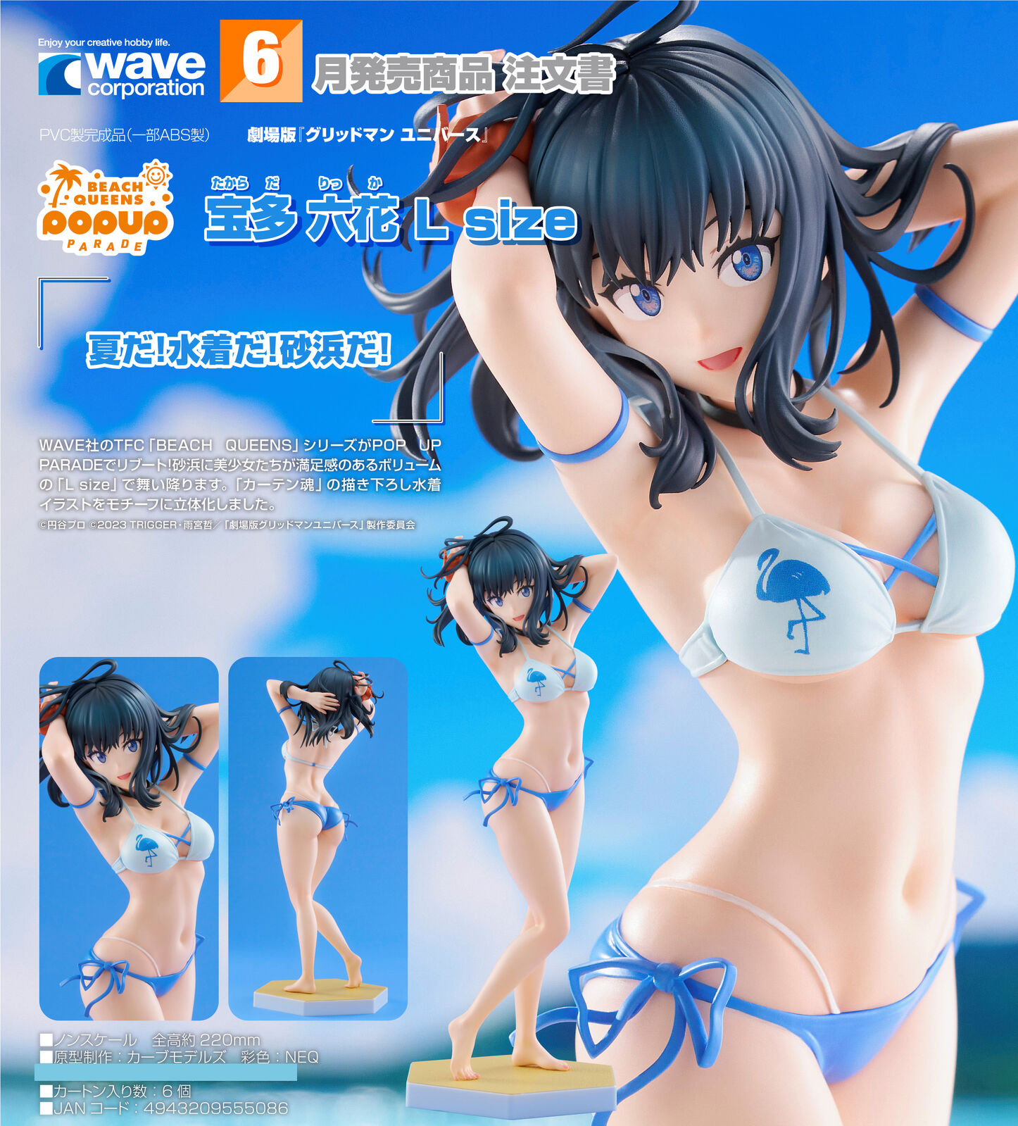WAVE's TFC BEACH QUEENS series is now back as part of the POP UP PARADE lineup! The beautiful queens of the beach are now here in L size for even more impact! The new figure of Rikka is based on her Curtain Damashii swimsuit illustration.