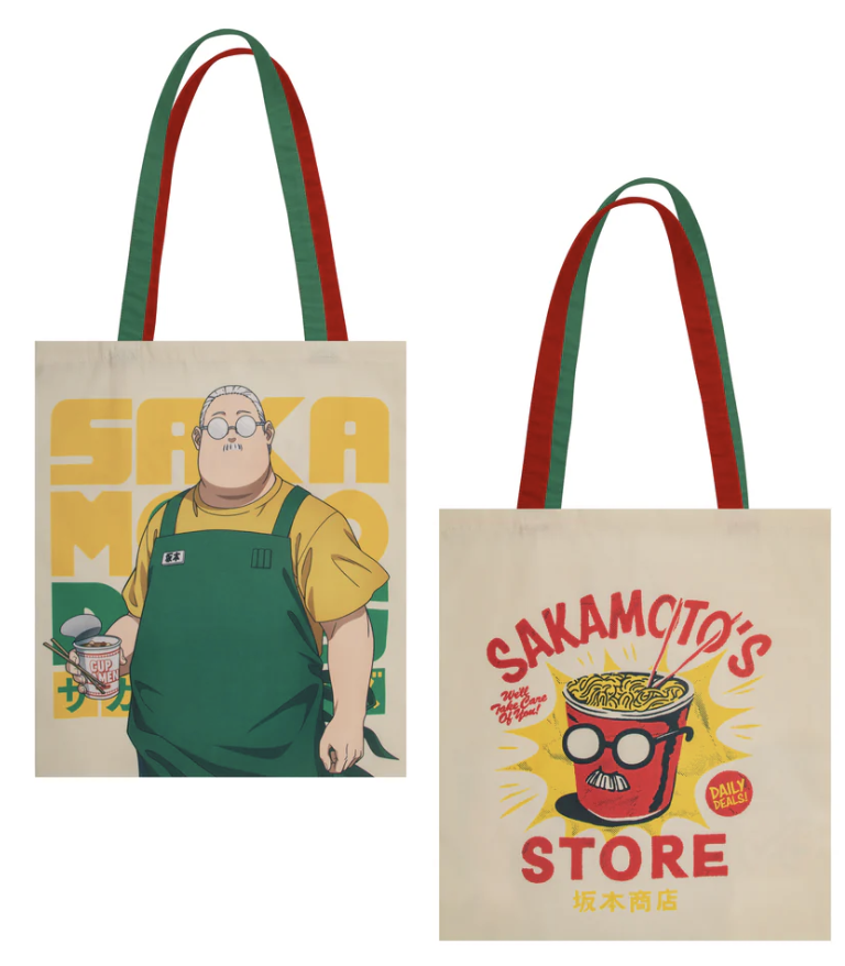 The front of this vibrant tote bag showcases Taro Sakamoto's iconic neutral expression and signature round white glasses. He casually holds his favorite cup noodles, dressed in his recognizable yellow shirt and green apron. On the back, "Sakamoto’s Store" is boldly printed in red, paired with a playful illustration of his cup noodles brought to life with his trademark look.