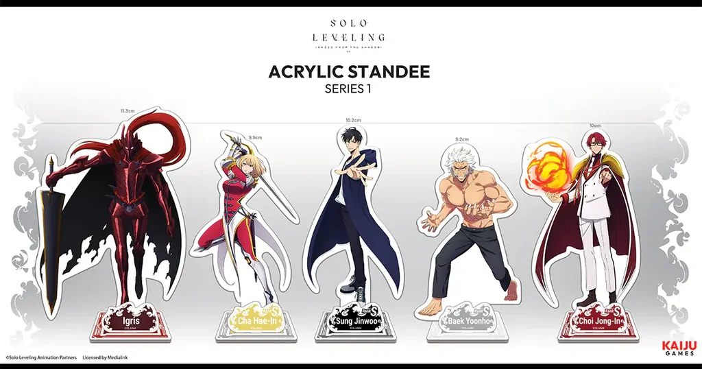 Character Line-Ups: Sung Jinwoo, Cha Hae-In, Igris, Baek Yoonho, Choi Jong-In - Material: Acrylic Standee - Height: About 10cm  - Includes Character Standee, Base Stand and name tag Packaging Info: - Packaging: Blind Bag.