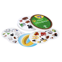 Nearly every card features eight different symbols, with the symbols varying in size from one card to the next. Any two cards have exactly one symbol in common. For the basic Spot it! game, reveal one card, then another. Whoever spots the symbol in common on both cards claims the first card, then another card is revealed for players to search, and so on. Whoever has collected the most cards when the 55-card deck runs out wins!
