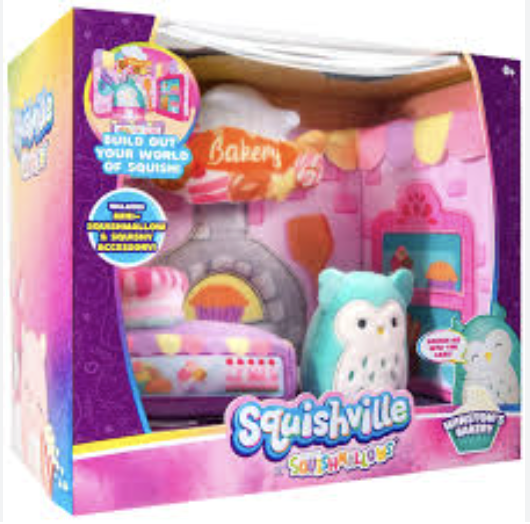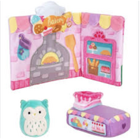 There are 2 exciting playsets to add to your Squishville plush toy collection. Expand your Squishville plush toy world with the Boutique and Bakery themes. Each accessory set comes with 1 fan-favorite mini-Squishmallow plush to collect. You can squeeze and squish your Squishmallow into hilarious places like the cake in the Bakery or the chaise in the boutique.