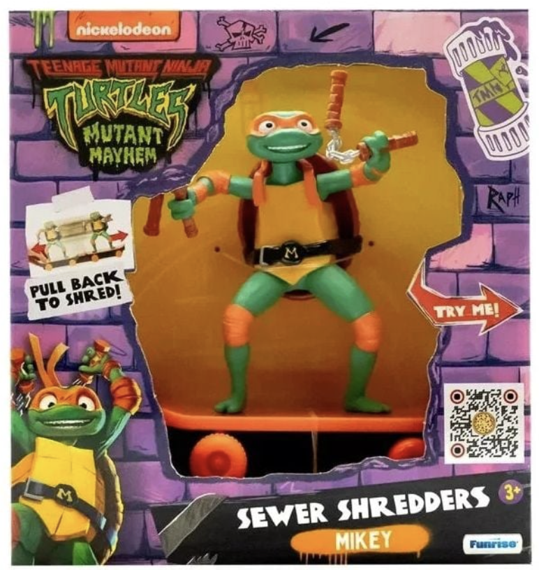 The Teenage Mutant Ninja Turtles Sewer Shredders are 5” skate toys built to battle and cruise! Movie-inspired design with your favorite Teenage Mutant Ninja Turtles holding their weapon of choice. Pull back the Ninja Turtle, let it go and watch it ride! Press the button on the Turtles’ half shells to initiate battle mode! Collect all 4 characters!
