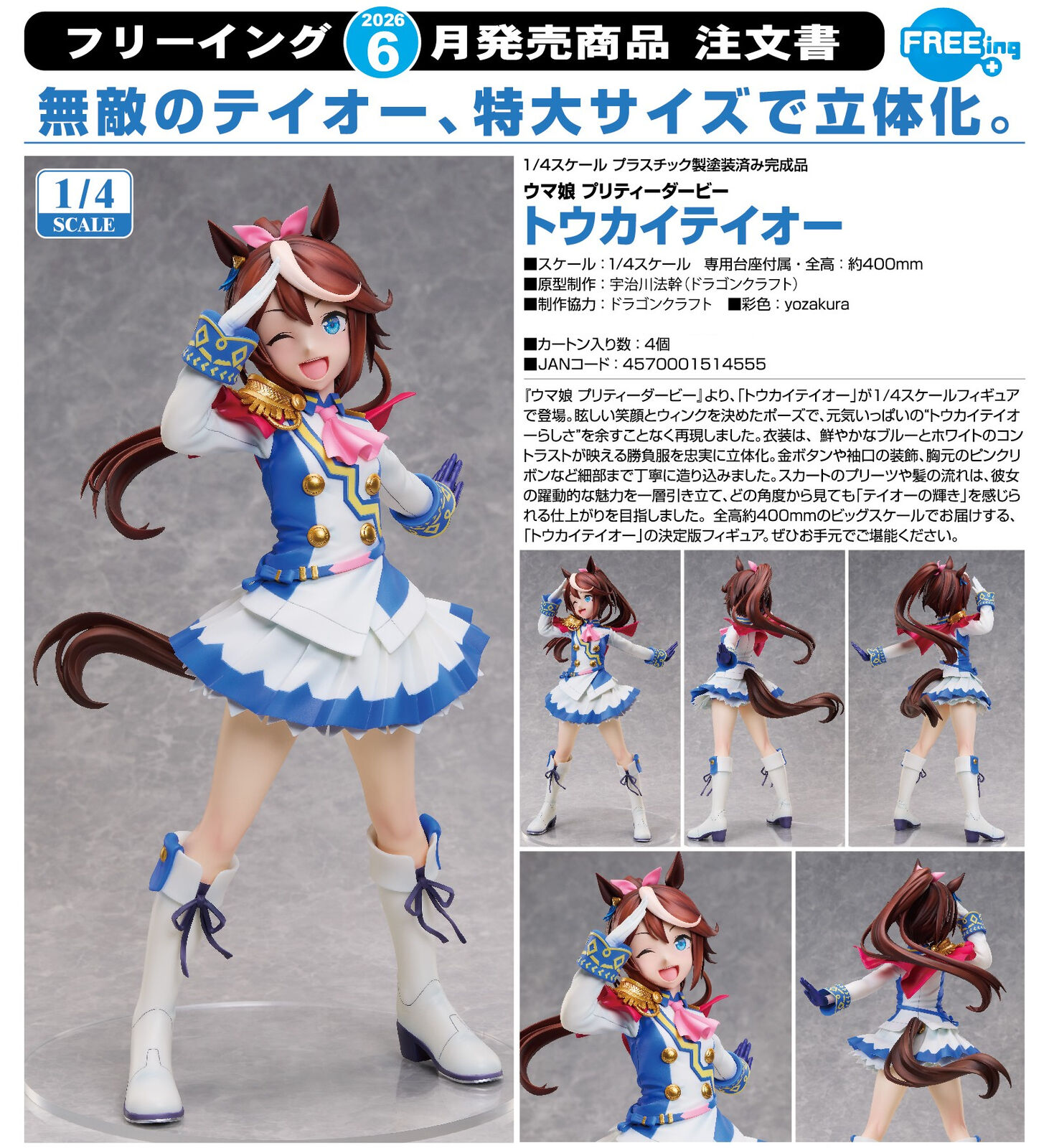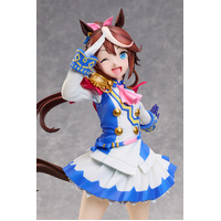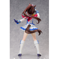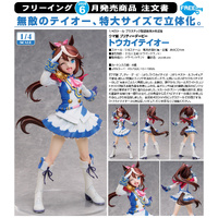 From "Umamusume: Pretty Derby" comes a 1/4 scale figure of Tokai Teio. Her dazzling smile and adorable winking pose that capture her energetic personality has been faithfully recreated in figure form. Her vivid blue and white outfit has been carefully sculpted to the smallest details, such as the gold buttons, accessories on her sleeves and pink ribbon on her chest. The pleats of her skirt and flowy hair have been sculpted to give the figure a dynamic appearance, allowing a perfect view of Tokai Teio's vibrant charm from any angle. Be sure to add this 400mm tall, large-scale recreation of Tokai Teio to your collection and enjoy every detail up close!