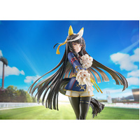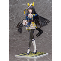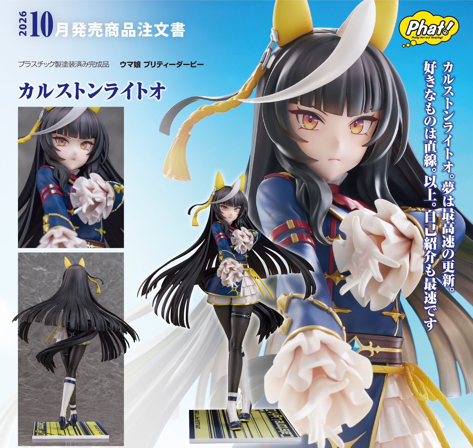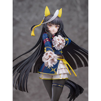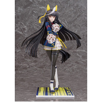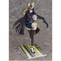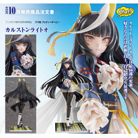 From the game "Umamusume: Pretty Derby" comes a 1/7 scale figure of Calstone Light O! Dressed in her “Clear-Cut Conviction” racewear, Calstone Light O has been sculpted with a dignified pose. Details of her design, such as her jacket and skirt frills, long, jet-black hair, sharp gaze, gestures and physique have all been faithfully reproduced in figure form. The angular base, inspired by Calstone Light O's love for straight lines, also adds an appealing touch to the figure. An interchangeable serious face plate for displaying Calstone Light O in her victory pose is also included. Be sure to add her to your collection!