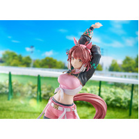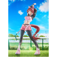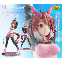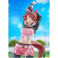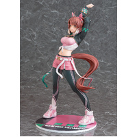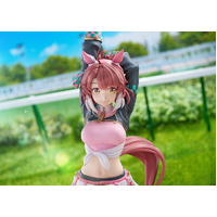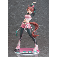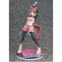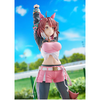 From the game "Umamusume: Pretty Derby" comes a 1/7 scale figure of Dantsu Flame. She has been captured in figure form wearing her "Center◎Spotlight" racewear whilst happily doing her stretches. Dantsu Flame is posed with her arms outstretched, making the figure seem like a snapshot of a natural moment just before she participates in a race. The supple curves of her twist, strong legs and flowing tail give the figure an energetic and dynamic silhouette. Her sporty racewear features a pink color scheme that has been faithfully brought to life. From her shorts and leggings to her sneakers, the figure features both athletic vigor and cuteness. Details such as the decorations on the cuffs and belt area have been carefully recreated as well. An interchangeable face part is also included for a different display option. By switching from a gentle smiling expression to a winking expression, you can enjoy a cheerful and energetic Dantsu Flame. The sleek base of the figure is decorated with Dantsu Flame's name and icons, adding a special touch to the figure when displayed. Be sure to add the hardworking and energetic Dantsu Flame to your collection!